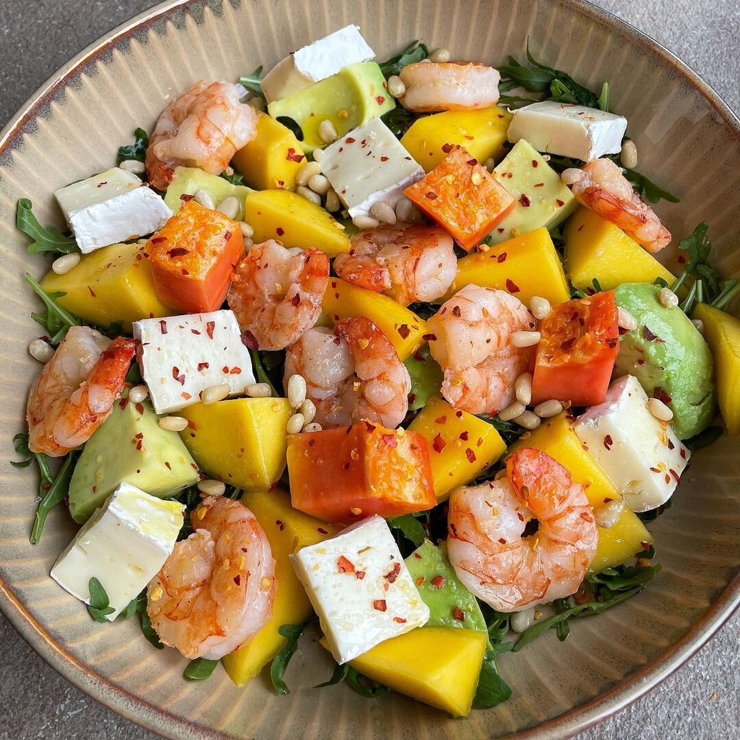 Салаты я ем каждый день и очень их люблю и вся моя семья тоже любит, мне вообще очень повезло что я могу есть не одна 😃 потому что я просто обожаю готовить, я кайфую от этого процесса и еще больше от того как наслаждаются вкусной и здоровой едой мои близкие ❤️ Что такое салат 🥗 набор полезных продуктов, которые миксуй между собой, что-то меняй и дополняй и на столе каждый день невероятное наслаждение с разными вкусами 👌 Сегодня я вновь выбираю свои любимые продукты и готовлю простой и вкусный салат 🥗 Руккола, манго, авокадо, жареные креветки, сыр бри, папайя и кедровые орехи 💛 Заправляю оливковым маслом, перцем чили с солью и соком лайма 💚 Все эти продукты очень полезны и прекрасно сочетаются друг с другом и дарят невероятное наслаждения от принятия пищи как гастрономическое, так и эстетическое 😍 На здоровье 💛 И Приятного Аппетита 💋