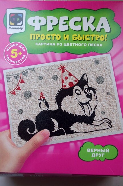 Покажу набор с фреской из разноцветного песка с клейкой основой, которую мы с Дашей недавно сделали. Фреска получается небольшая: 14x10 см. Коробка от набора выглядит так: Песок в наборе был четырёх цветов (красный, серый, бежевый и чёрный). На клейкой бумажной картине-основе изображены собака и птичка в праздничных колпаках. Отдельно прилагается рисунок-инструкция, где с помощью цифр показано какие части рисунка какого должны быть цвета. Также в набор входит двухсторонний скотч и плотная картонка по размеру картинки. На неё надо наклеить уже готовую фреску . У нас в итоге получилась вот такая симпатичная фреска: Для Дашиного возраста (3,5 года) картинка мелковата. Но зато Даша потренировалась в поиске цифр на картинке. Стоил набор чуть более 60 рублей. Нам фреска понравилась!