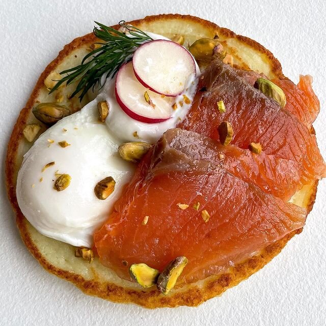 На прошлых выходных мы ходили в ресторан и я смотря меню выбираю одни и те же блюда, мне хотелось брускетту с лососем и яйцом пашот, или драник с тем же яйцом пашот или буррату с томатами, сказав мужу о своих пожеланиях он ответил, зачем в ресторане есть то, что ты каждый день готовишь дома! Как порядочная жена, я послушала мужа и заказала жареный рис с угрем и жареным яйцом, было вкусно, но я мысленно представляла сколько же масла ушло на жарку того самого риса, да и яйцо было поджарено не как я люблю.... Хорошо стакан холодного пива 🍻 сгладил ситуацию 👌 В общем выйдя из ресторана драник с лососем не давал мне покоя и я решительно была настроена его себе приготовить, а то когда еще в ресторан поведут 😅 Итак, ловите супер вкусный и простой драник 🥂 В блендер отважно отправились 💃 лук шалот половинка, 4 мини картофеля (на мой взгляд не такой он и мини был), 1 яйцо, чуть соли и в итоге 3ст.л. рисовой муки, перемешавшись до однородной массы, мной было принято решение жарить один боль