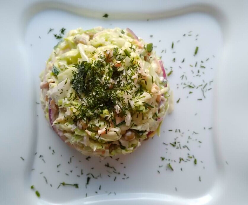Это простой рецепт, который не требует больших денежных и временных затрат. Салат из свежей капусты и жареной курицы легко приготовить после рабочего дня. Для тех, кому нужен ужин посытнее, к салату можно отварить картофель, тем, кому не нужны лишние калории, его можно подать без гарнира. Сегодня готовлю простой салат с ранней белокочанной капустой. Капусту шинкую тонкой соломкой, добавляю немного соли и слегка мну руками. Огурец нарезаю кубиком. Лук режу тонкими перьями. Куриное филе отбиваю тонко, натираю солью и специями. Обжариваю на раскаленной сковороде с растительным маслом с каждой стороны по 5-7 минут. Нарезаю жареное куриное филе соломкой. В посуду с капустой складываю огурец, лук, курицу. Добавляю зеленый горошек, перемешиваю и даю постоять минут 5, чтобы выделился сок. Добавляю немного майонеза и перемешиваю. Можно добавить зелень по вкусу, а салатный лук заменить на зеленый. Салат со свежей капустой готов! На здоровье! Другие мои рецепты салатов: 2 овощных салата с ин