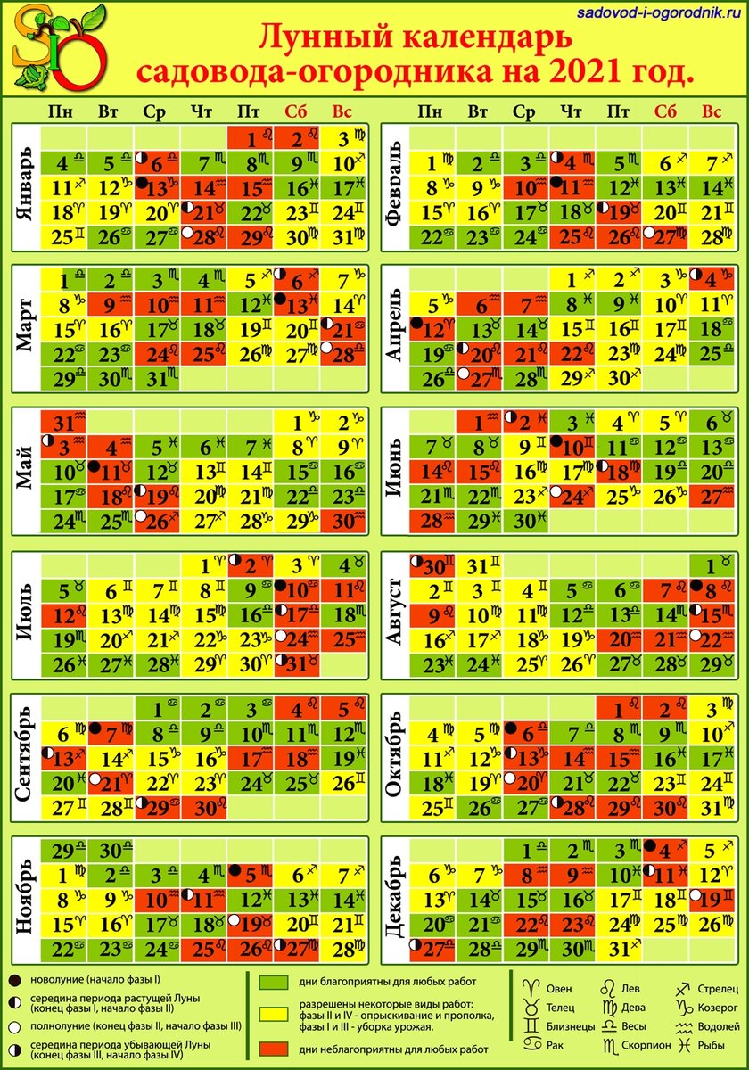 Зачем нужен краткий лунный календарь на весь год Преимущества краткого общего лунного календаря садовода-огородника на 2021 год Как пользоваться годовым календарем Благоприятные для работ дни отмечены зеленым цветом. Планируя дела в это время, помните, что посев, прополку и опрыскивание лучше всего проводить в фазах II и IV, а посадку, полив и подкормку в фазах I и III.
