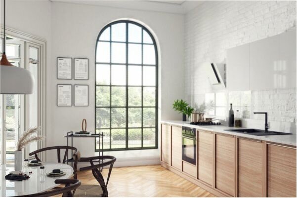 Когда дело касается обустройства кухни, существует множество возможностей. Классика, модерн, гламур, ретро, скандинавский или лофт - в каждом из них есть свой шарм. Для одних приготовление еды - любимое занятие, для других - необходимость и монотонная обязанность. Поэтому, чтобы позаботиться о собственном благополучии и комфорте, а приготовление еды было приятнее, стоит оформить интерьер собственной кухни индивидуально. В современных интерьерах и студиях используются открытые кухни, которые становятся частью гостиной. В зависимости от потребностей и условий, кухня этого типа может быть расширена или состоять из ряда на одной из стен. В просторном интерьере с исключительно высоким потолком дизайнер создал мини-кухню, соединенную с гостиной. Простые фасады нижних шкафов, выполненные из деревянного шпона теплых тонов, и простые перила над верхом идеально сочетаются с деревянным паркетом в елочку. Навесные белые шкафы с гладкими фасадами без ручек хорошо сочетаются с белым кирпичом на ст