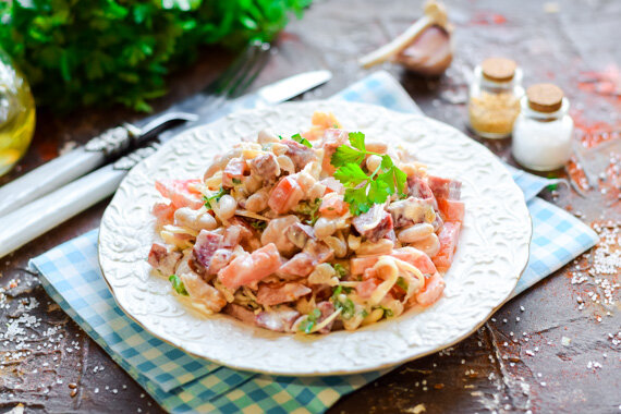 Вкуснейший салат с консервированной фасолью и колбасой - простой рецепт