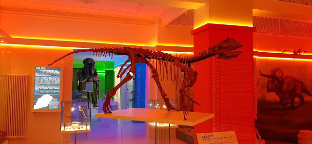Никак не ожидал двух вещей: а) что музей природы в Кемерове такой шикарный и б) что самыми интересными в нем будут залы, посвященные геологической истории, а также ископаемым животным. Вот как-то в музее Улан-Батора ожидаешь увидеть так много костей динозавров, но никак не в музее столицы Кузбасса. Отдел природы Кемеровского краеведческого музея находится в красивом здании сталинской архитектуры в центре города. Напротив него - отдел истории, тоже, как говорят, обновленная экспозиция, но туда надо отдельные билеты покупать, плюс времени не было, да и три музея в один день - уже перебор, в музей природы мы ведь приехали после "Красной горки" - про посещение ее рассказывал здесь. Вход в музей стоит 300 рублей, дороговато для краеведческого, но поверьте, посещение стоит таких денег. Первое - это древняя история Кузбасса. На пол проецируется интерактивная карта, которой можно управлять ногами - просто переходя от одной кнопки к другой. Даже нам понравилось менять карты, фотографии и карти