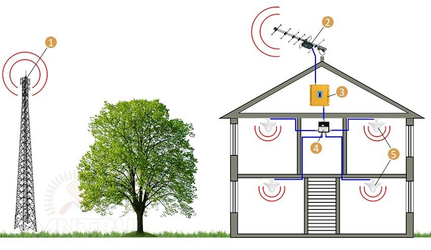 Сотовая связь на даче – давно не роскошь, но все ещё не повсеместная услуга. Несмотря на развитие информационных технологий, на карте до сих пор встречаются белые пятна – места, где сотовый сигнал не ловится вообще или ловится со значительными помехами. Особенно этим страдают дачные поселки. Одним из востребованных девайсов на данный момент является грамотно подобранная система усиления связи для дачи. Как можно усилить сигнал сотовой связи и реально ли сделать это самому – читайте в этой статье. Как работает сотовый сигнал и зачем его усиливать? Россия покрыта сетью вышек сотовых операторов – базовыми станциями. Сигнал от сотового телефона, как только абонент набирает номер адресата, идёт на базовую станцию. Там сигнал обрабатывается, и базовая станция отыскивает второго абонента в своей базе. Так два абонента устанавливают связь друг с другом. Не везде эта схема проходит идеально – базовая станция улавливает сигнал от своего абонента, если он находится на удалении не более 35 километ