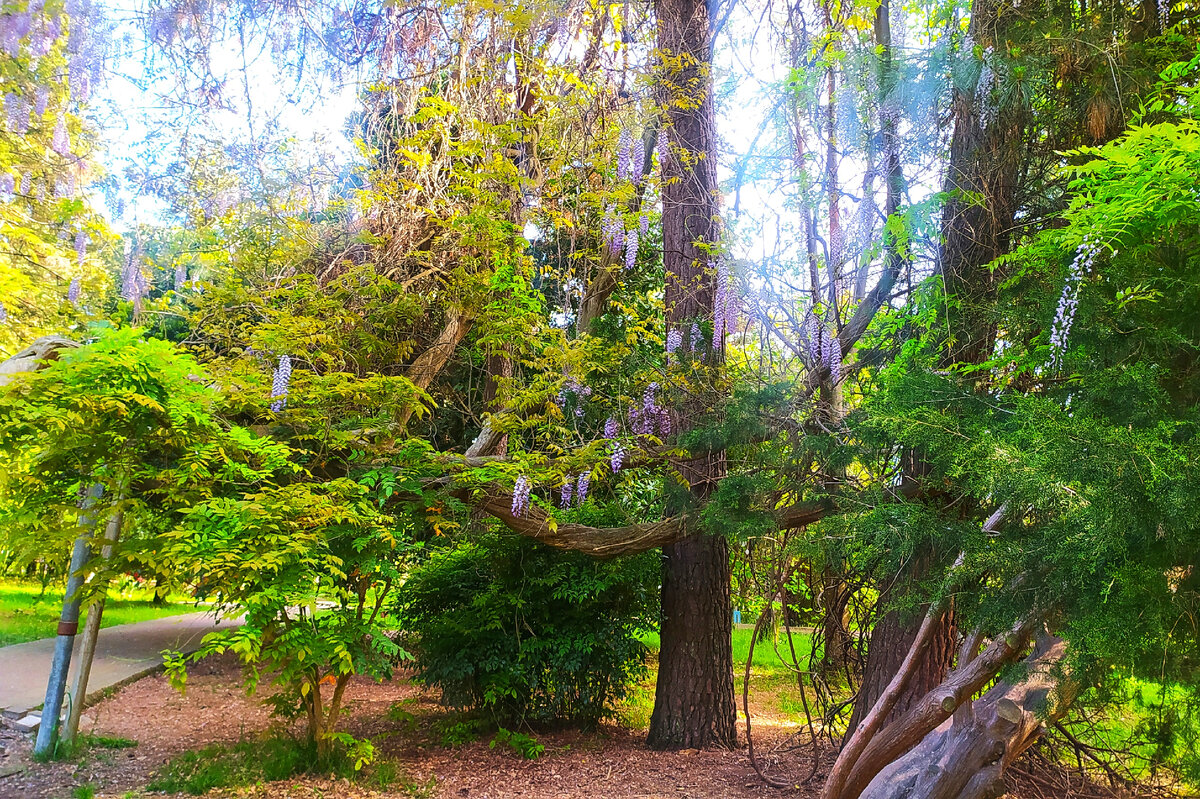 В дендрарии города Сочи расцвела глициния, посаженная больше века назад! Глицинию китайскую посадили в 1892 году. Это одна из старейших глициний Сочи, которая, несмотря на свой внушительный возраст, продолжает цвести и радовать всех своим необычным видом. За 135 лет глициния, опираясь на растущий рядом граб, успела подняться на высоту более 17 метров. Со временем граб достиг своего предельного возраста и погиб, поэтому специалистам пришлось искать для глицинии новую опору. С помощью специальных конструкций она была перенаправлена на расположенные вблизи сосны, по которым сейчас и вьётся. У растения - больше 17 лиановидных стволов. Причудливое переплетение лиан создаёт иллюзию настоящей сказки — так и хочется прикоснуться к ним, ощутить всю силу и мощь. А попадая под раскидистые ветви сосен, по которым, переплетаясь, ползут стебли, увешанные сейчас крупными нежными гроздьями-соцветиями, на секунду даже перестаешь дышать. Эти выразительные кисточки длиной от 10 до 40 см напоминают собой