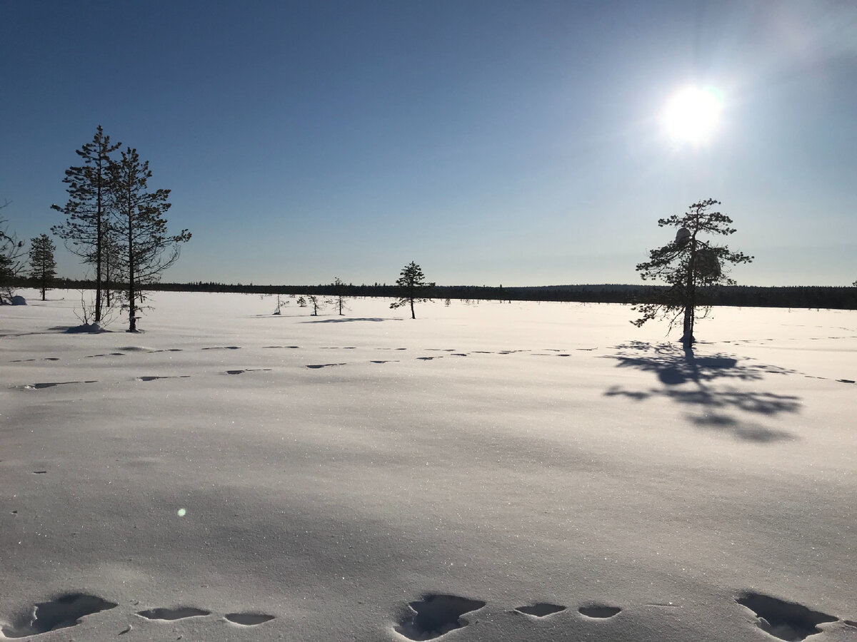 Мы заняли свои места и помчали в мороз. Еще утром мне казалось, что я уже замерзла, но мы еще не выехали даже. Вероятно, это был страх наперед, да и прошел он быстро. Мы ехали по болотам, по реке, по лесу. С рекой очень было интересно – почему-то она не вся замерзает зимой, даже в такой дикий мороз. Это удивительно, но доподлинно неизвестно почему так происходит, кажется, самая популярная версия – наличие теплых, живых источников, которые не дают ей замерзнуть. Выглядит это красиво. Мы ехали по буранке. Это снежная тропа, проделанная снегоходами, а вокруг были проталины, на воздухе в районе минус сорока. Удивительное чудо природы. Утром из незамёрзших мест поднимался пар и расстилался вдоль реки насколько мог. Болота сразу было заметно. Это полностью покрытое льдом и снегом огромная территория и из гладкой белой поверхности изредка торчат гиблые растения – высохшие стволы деревьев, палки, желтые сосны, елки. Гиблое такое местечко. Иногда в ходе дороги я думала, а как сейчас там под тол