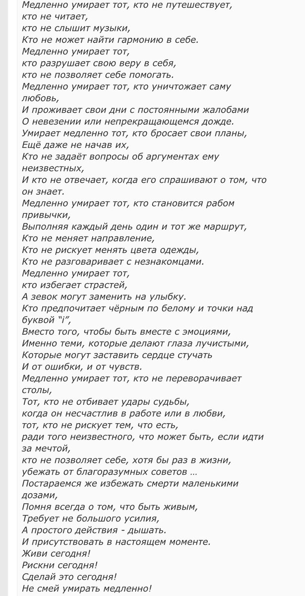 Я не люблю поэзию, но стих «Медленно умирает..» до мурашек отозвался во мне. А автор точно неизвестен, есть два варианта