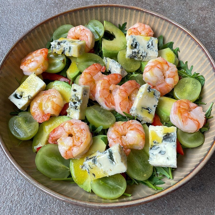 Записывайте 🙌 готовьте 👍 и наслаждайтесь очень вкусным салатом. Руккола, болгарский перец, авокадо, жареные креветки, виноград, сыр с голубой плесенью 💙 Заправка 🥂 1 ч.л. дижонской горчицы, 1 ч.л. меда, оливковое масло, сок половинки лайма, тщательно перемешиваю и заправляю салат 🥗 Ну очень 😋😋😋 На здоровье 😉 И Приятного Аппетита 💋