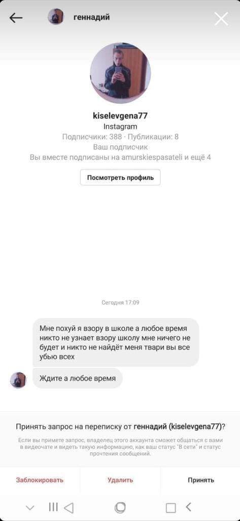 На этот раз к нам пожаловал 20-летний Гена Киселев из Амурской области, который в инсте и телеграмме заявлял о том, что устроит теракт в школе.