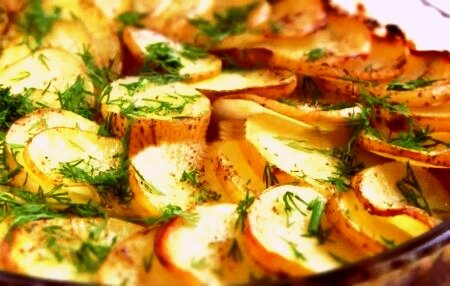 Сегодня готовим очень вкусную запеченную картошку по-украински с беконом и кабачками. Картошку можно запекать с любыми овощами: баклажаны, сладкий перец, лук, помидоры. Вместо бекона - сало с прорезью. Приправы на свой вкус. Ингредиенты: картофель молодой - 500 г; кабачки - 1-2 шт.; бекон - 200 г; чеснок - 3-4 зубка; масло растительное - 2 ст. л.; соль, специи по вкусу; зелень укропа. Процесс приготовления картошки по-деревенски. Для начала кабачки на режем кружочками. Посолить их и оставить на 10-15 минут. Затем лишнюю жидкость сливаем. Вымываем очень хорошо молодой картофель, кожуру не снимаем. Нарезаем также кружочками. Бекон или сало нарезаем пластинками и Теперь в форму, смазанную слегка растительным маслом, выкладываем кабачки. Также выкладываем чеснок, который нарезали пластинками. Размещаем бекон. Картофель, который сверху посолить и приправить специями. Накрываем фольгой и запекаем наше блюдо минут 20. Затем снимаем фольгу и готовим еще минут 20. Температура в духовке до 200 г