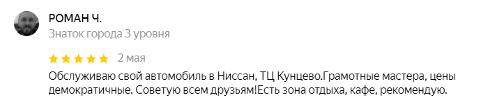 Самое лучшее достижение нашей компании - это отзывы наших клиентов. Мы благодарим всех за обратную связь, Вы мотивируете нас становиться ещё лучше! "Обслуживаю свой автомобиль в Ниссан, ТЦ Кунцево.Грамотные мастера, цены демократичные. Советую всем друзьям!Есть зона отдыха, кафе, рекомендую." "Внимательный сервис с хорошими ценами" "Нареканий нет, все отлично" "Хороший сервис. Обслуживаю на этой станции уже второй автомобиль , Чисто , уютно , есть где скоротать время пока делают обслуживание. Рядом крупный торговый центр Vegas. Персонал сервиса очень приветливый , а главное сразу видно , что люди находятся на своем месте. Одним словом профессионалы. Всегда рекомендую своим знакомым." Мы благодарим всех наших клиентов за отзывы. Будем рады увидеть вас в Ниссан Кунцево!