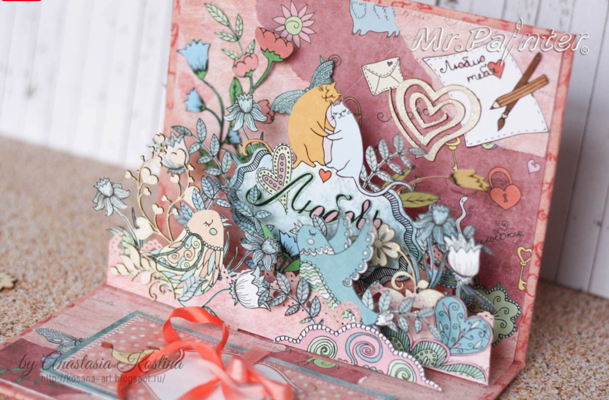 Сегодня я хочу вам показать самую популярную открытку, которую у меня просят изготовить на заказ на интернет-ресурсе товаров ручной работы - "Ярмарка Мастеров". Дизайну этой открыточки уже много лет. Изготовила таких открыток я уже больше десятка. Обычно заказчики молодые люди, которые хотят удивить своих подруг. Я бы такому сюрпризу была бы очень рада. Открытка тканевая, в мягкой обложке, размером 14х19 см. Завязывается на ленты. Самая фишка открытки в том, что она объемная внутри. В работе я использовала бумагу от Mr.Painter коллекции "Мур-Мур". Бумага очень задорная! И работая с ней, заставляет получать истинное вдохновение! Сколько мотивов, сюжетов... Игривая, яркая, при этом очень душевная! А название какое)) мур-мур... Во -первых уже необычно то, что открытка обтянута тканью, она мягкая, т.к. проложена еще тонким слоем синтепона. А еще открытку можно использовать не только как открытку в классическом предназначении, но и вложить вовнутрь что-то, какой-нибудь презент, например сл