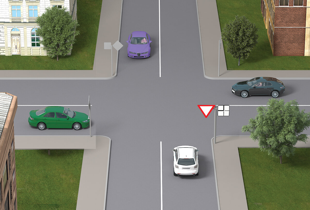 Доброго времени суток Вам, уважаемые водители и пешеходы. На связи канал "Подорожник"! Предлагаю вам сейчас немножечко размяться и освежить свои знания ПДД, решив интересную задачку. Постарайтесь принять решение максимально быстро, но сохраняйте при этом максимальную концентрацию, как и положено делать на дороге. Вопрос: Водитель какого автомобиля покинет перекрёсток последним? Варианты ответа: 1) Водитель белого автомобиля 2) Водитель зелёного 3) Фиолетового 4) Чёрного Друзья, тренируйте себя время от времени подобными задачками, чтобы быть всегда в хорошей форме. Ну что, вы уже определились с выбором варианта? Надеюсь да, ведь мы переходим к разбору. На нашем рисунке показан Х-образный перекрёсток, к которому подъехали 4 автомобиля. Так уж совпало, что все водители намерены проехать прямо. Как мы видим, данный перекрёсток является не регулируемым, а порядок движения на нём помогут определить знаки приоритета, а именно: 2.4 "уступите дорогу", который мы видим перед белым авто,а такж