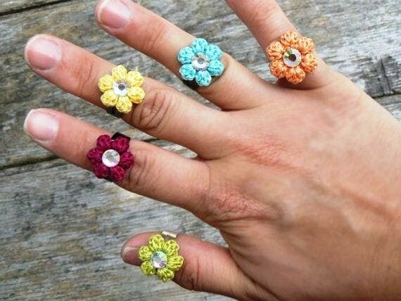 Принято считать, что "лучшие друзья девушек - это бриллианты"... Но, так ли это?))) Нашла милую идею для вязания - кольца. Да, да! Вязаные колечки на девичьи пальчики. Хочу поделиться данной находкой с подписчиками канала и с теми, кто случайно набрёл на этот пост))) Не скажу, что изделие супер-полезное, но, то, что оно оригинальное и довольно забавное, думаю, Вы спорить не станете... Итак, оказывается колечки бывают не только золотыми и серебряными, но, и вязаными. Причём связать такую безделицу можно, как крючком, так и спицами. Обычное вязание по кругу спицами... или же крючком... Крючком, конечно, колечко получиться более плотным... Украсить вязаные кольца можно по разному, исходя из своей фантазии и возможностей. Давайте рассмотрим примеры декора таких изделий. 1. Различные цветочки... Декор вязаными цветами всегда смотрится красиво... А цветочки вязать совсем не сложно. Схем небольших вязаных цветов в инете великое множество. Я не вязала ни один из представленных на фото цветов.