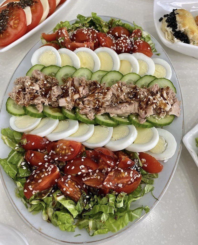 Салат с тунцом: Подушка из зелени на ваш вкус (листья салата, руккола, пекинская капуста, что вам больше нравится). 🍅Свежие помидоры. 🥒Свежий огурец. 🥚Варёное яйцо. 🐟Консервированное филе тунца. Соус: Соевый соус- 1 ст.л. 🍯Мёд- 1 ч.л.(или сахар 0,5 ч.л.) 🫒Масло оливковое- 2 ст.л. 🍋Лимонный сок- 1 ст.л. Соль, чёрный перец по вкусу. Можно использовать готовый соус «Терияки», тоже будет не плохо Красиво собираем салат на блюдо, поливаем соусом, присыпаем кунжутом. Очень вкусный, полезный, низкокалорийный салатик.