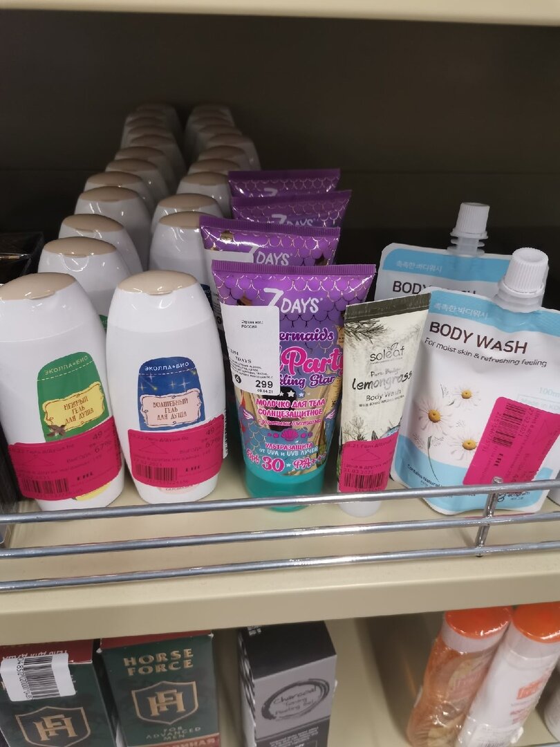 Смотрите, какая прелесть продается за 49 рублей. На одном из белых флакончиков написано, что это волшебный гель для душа. Разве можно после такого устоять? Далее идут импортные средства по цене от 100 до 139 рублей.