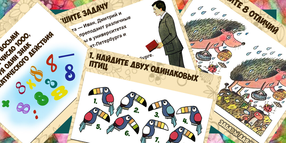 Здравствуйте, дорогие друзья! Вы готовы пройти проверку на внимательность и смекалку? Задания с тестами и логическими задачками вас уже ждут. Настройтесь на разгадывание замысловатых загадок. Вы справитесь! Отвлекитесь на несколько минут от дел, сделайте паузу и немного отдохните. 1 задание - тест на внимательность. Перед вами восемь туканов или попугаев. Ну, будем считать этих птиц попугаями. Среди них нужно найти двойняшек. Нашли одинаковых попугаев. Напишите номера птиц в комментариях. 2 задание тоже на внимательность. Нужно сравнить две почти одинаковых картинки. На них все-таки есть отличия и их восемь. Рассмотрите иллюстрации с ежиком, собирающимся принимать водные процедуры под осенним дождем. Сможете найти все отличия? Нашли, чем отличаются картинки? Отлично! 3 задание - это логическая задача. Прочитайте условие. Учитывайте все уточнения. Выстраивая логическую цепочку, вы обязательно придете к верному решению. Разобрались? Нашли ответ? Напишите его в комментариях. 4 задание н