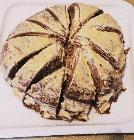 Торт в данном случае, конечно, не буквально торт — коржи для этого занимательного блюда русской народной кухни выпекаются из свиной или говяжьей печени ИНСТРУКЦИЯ ПРИГОТОВЛЕНИЯ 1.Печень промыть, срезать жилки, разрезать на куски. Проверить, нет ли камней и прочего мусора. Перемолоть на мясорубке. 2.К печени добавить все по очереди, яйца, молоко, муку (через сито), соль, перец, масло, сода. 3.Все перемешать, лучше миксером. 4.Жарить на сковороде как обычные блины. 5.Майонез смешать с чесноком и смазывать каждый блин, сооружая постепенно торт! Немного дать настояться в холодильнике. Еще больше рецептов на сайте eda.ru
