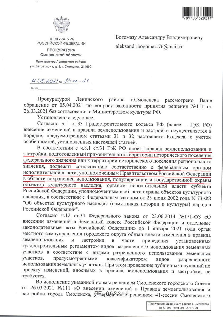 Смоленский городской Совет 26.03.2021 принял решение о внесении изменений в Правила землепользования и застройки города. Однако городская администрация, подготовившая проект решения, предварительно не согласовала его с Министерством культуры РФ. Смоленск относится к числу исторических поселений России и такое согласование обязательно.
