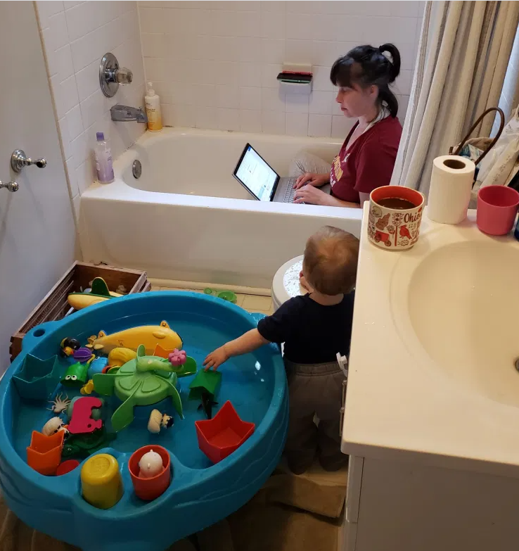 В апреле 2020 года, во время первой волны пандемии, муж Хайди Льюис, матери двоих детей из штата Мэриленд, сфотографировал, как она пытается работать из дома. Хайди оборудовала себе рабочее место прямо в ванне, чтобы не оставлять без присмотра годовалую дочку Харриет, которая играет с водой. Фото с тех пор широко разошлось по соцсетям, потому что в одной лодке с Хайди оказались миллионы мам, которым в условиях карантина, а также закрывшихся детских садов и школ нужно было совмещать удаленную работу, дом, уход за младенцами и помощь с дистанционным обучением детям постарше. Недавно популярность фотографии снова вышла на пик, потому что читатели газеты The Washington City Paper выбрали ее в качестве одного из символов прошедшего года пандемии. Символов, демонстрирующих массовое родительское выгорание и невероятную усталость. «Наш типичный день во время карантина — это хаос, плач и тонны перекусов, — вспоминает в интервью GMA Хайди. — Самым трудным в том, что оба ребенка оставались дома,