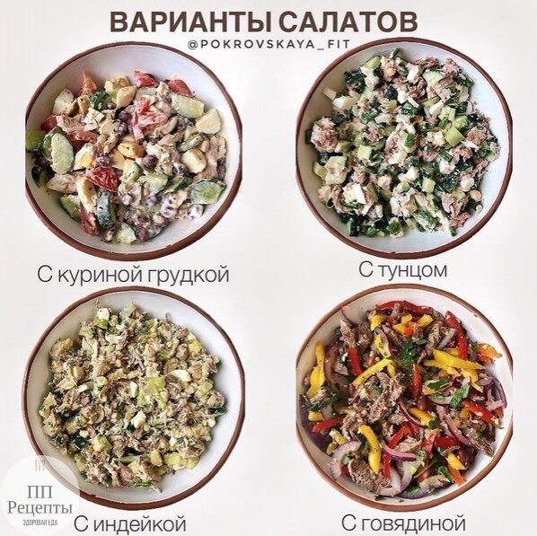 1) Салат с куриной грудкой и фасолью КБЖУ на 100 г: 138,3/12,6/3,3/14 🔸куриная грудка - 130 г 🔸1 огурец 🔸1 помидор 🔸2-3 яйца 🔸красная фасоль (пол-банки) 🔸сметана 🔸соль, перец, специи Приготовление: 🔸Яйца отварить, готовую куриную грудку, огурец, помидор и яйца нарезать. Все смешать и заправить сметаной. Посолить, добавить специи. ⠀ 2) Салат с тунцом КБЖУ на 100 г: 87,6/10,3/4,2/1,5 🔸2 огурца 🔸1 банка тунца с/с 🔸3 яйца 🔸1 зуб чеснока 🔸зеленый лук 🔸2 ст.л сметаны 🔸соль, перец, специи Приготовление: 🔸Огурцы, зелёный лук, яйца нарезаем. С тунца сливаем воду, добавляем в салат. Выдавливаем чеснок, солим, перчим, заправляем сметаной. ⠀ 3) Салат с индейкой и шампиньонами КБЖУ на 100 г: 74,4/9,4/2,1/4,1 🔸индейка (у меня филе бедра) - 300 г 🔸шампиньоны - 150 г 🔸огурец - 1 шт. 🔸2 яйца 🔸2 картофеля 🔸лук зелёный, укроп 🔸домашний майонез/сметана - по вкусу 🔸соль, перец, специи- по вкусу Приготовление: 🔸Филе индейки, яи