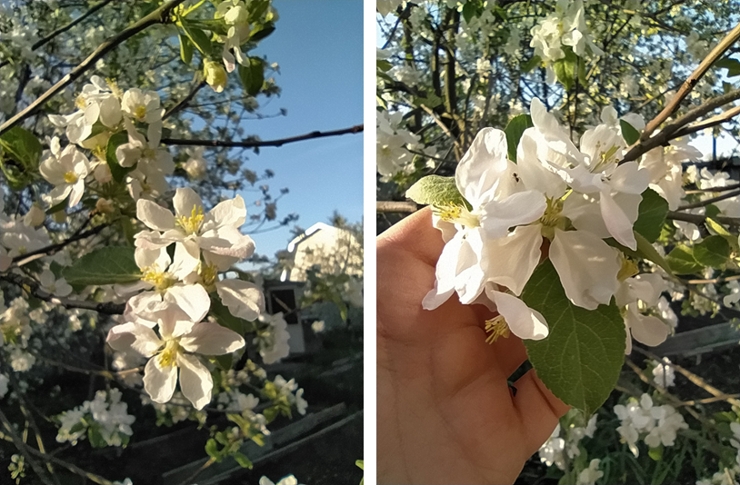 У нас в Подмосковье жара. Зной, который ставит рекорды, такой какого не было в эти даты за всю историю метеонаблюдений. А влаги еще много, перед этим заливало дождями и заваливало снегом. Теперь трава и зелень прет, все цветет разом. Очень красиво и ароматно цветут яблони: Яблонь у нас 6, все не молодые, все разные, достались нам 10 лет назад с участком и сорта мы не знаем. Цветет все, и вишня, и черешня, и слива, и терновник, и махровая сирень, и цегофагус, и клубника, и ирга, и смородина, и крыжовник. Аромат кружит голову и сбивает с ног. Соседские коты и кошки бродят среди наших цветов и зарослей с очень серьезными лицами. Мы им приносим угощения и они ждут подношений. Очень довольны их визитами, у нас нет ни мышей ни крыс. Жалко только пропавших маленьких серых ящерок, что в предыдущие годы время от времени выбирались из-под сарая погреться на солнышке. В дачное окно заглядывает цветущий куст терновника: Гиацинты еще не отцвели, а купальницы уже подняли свои головки: В окно на кух