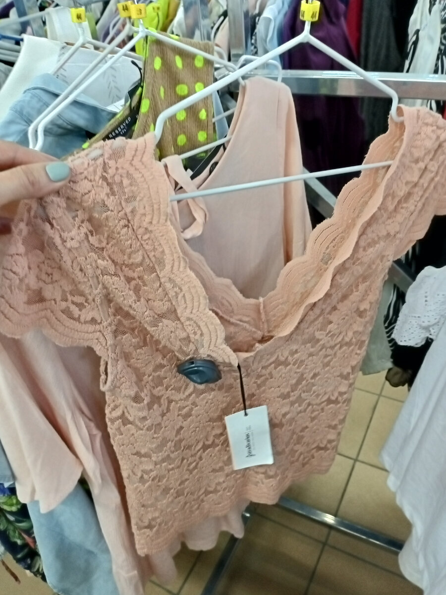 Есть такой магазин, о котором я узнала не так давно. Называется Woss. Это оффпрайс, самая известная сеть такого формата, всем известная Фамилия. Так вот, было у меня задание от дочери купить ей белую блузку для школы. Тонкую и желательно, немнущуюся. Я заехала в Фамилию на Тушинской, но ничего интересного в ней не нашла. В торговом центре напротив находится тот самый магазин Woss. Надежд особых не питала, т.к. мои прошлые визиты в этот магазин не особо впечатлили, уходила без покупок. Почитать мой первый обзор из него можно в этой статье Но сегодня, просматривая рейлы с блузками, мне попались очень интересные цены. Сразу скажу, это всего лишь обзор ассортимента с максимальными скидками. Купила из всего этого обзора я лишь одну вещь, о которой напишу в самом конце статьи. Итак, все по 10 рублей(не секонд-хенд) Прозрачный кружевной топ от молодежного бренда недорогой одежды Stradivarius. Конечно же синтетический. Размер М Дефектов не обнаружено. Цена 10 рублей при первоначальной стоимос