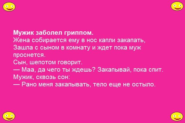 Уехал муж в командировку. Жена, привела любовника. — Через десять дней раздается дверной звонок. Жена (с ужасом в голосе): — Муж! Любовник (с облегчением): – Ну, наконец-то! Бракоразводный процесс. Судья спрашивает жену: – По какой причине вы хотите развестись с мужем? – Он меня как мужчина не удовлетворяет! Женский голос из зала: – Всех удовлетворяет, а её нет! Мужской голос из зала: – А её никто не удовлетворяет! Двое приятелей. – Чего это ты вырезаешь из газет? Вот заметка о муже, убившему жену, которая шарила по его карманам. – И что же ты с ней сделаешь? Положу в свой карман. Женa спрашивает мужa: — Ты не знаешь где мой телефон? Я постaвил его на зарядку. — Зачем? А то ты опять вечером скажешь что не доступно. У меня жена проводница поезда. Когда она в отпуске, всю ночь приходится кровать качать. — Как перестаю, она встает и идет туалет закрывать. Жена говорит мужу: — У меня для тебя две новости, хорошая и плохая. Ну и какие же? — Я от тебя ухожу. Так так и ка