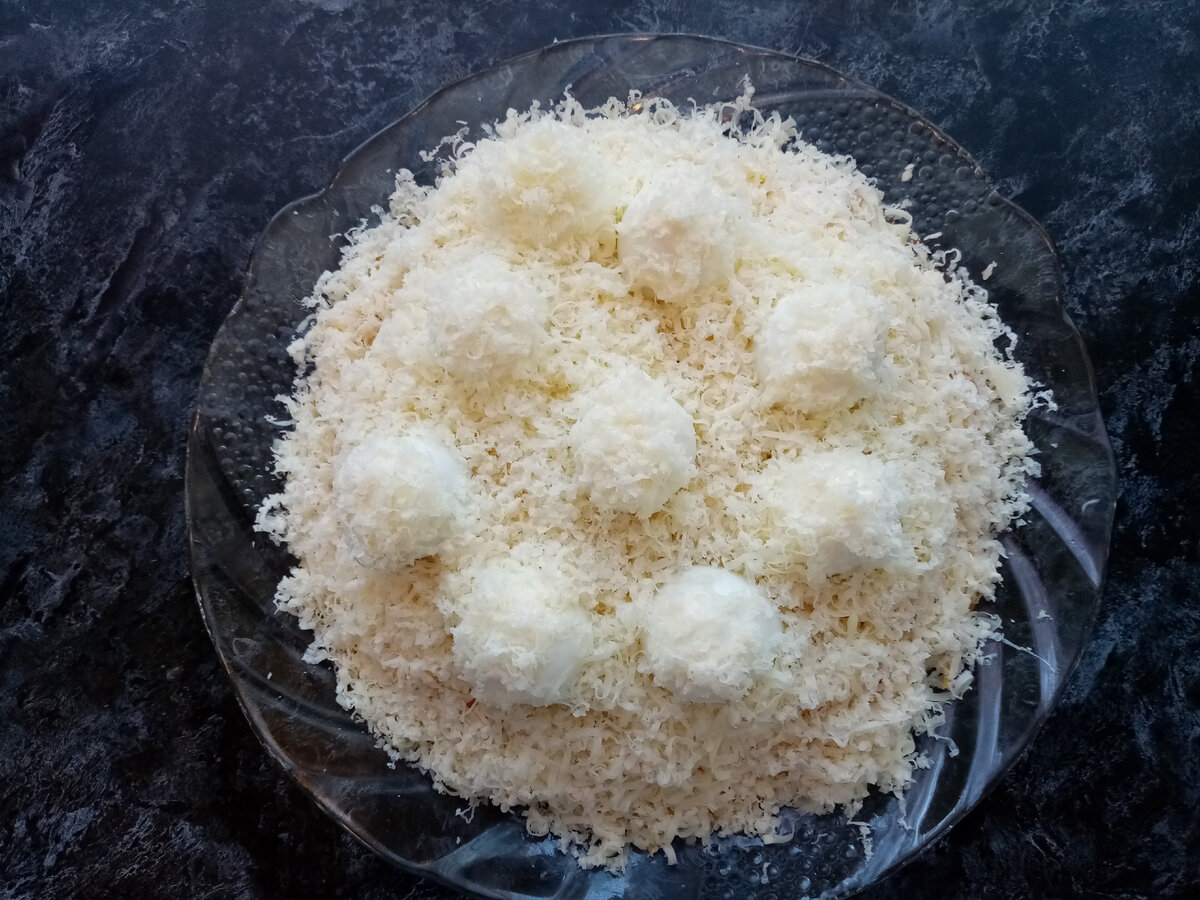 Ингредиенты: - Яйцо – 5 шт. (желательно покрупнее) - Куриная грудка вареная - 1 шт. - Картофель - 2 шт. (для фри) - Сыр – 200г. - Майонез (лучше домашний) или сметана – 200 мл. + 100мл. - Чеснок – 2 крупных зубчика - Масло растительное – 200мл. Приготовление: 1. Отварить грудку, разобрать на волокна или порезать кубиками. 2. Отварить яйцо. 3. Пожарить картофель – фри: натереть картофель на корейской крупной терке, промыть в холодной воде. Положить в дуршлаг, затем на салфетку, просушить. В хорошо разогретое масло кладем порцию натертого картофеля, обжариваем до золотистой корочки. Выкладываем на салфетку и т.д. 4. Разрезаем яйцо пополам, убираем желток, растираем его с майонезом или сметаной, солим, перчим, добавляем раздавленный чеснок. И фаршируем половинки яиц. Собираем салат на плоское блюдо: 1. Мясо. 2. Сетка из майонеза. 3. Картофель-фри. 4. Сетка из майонеза. 5. Сыр (половину), потертый на мелкой терке. 6. Сетка из майонеза. 7. На сыр выкладываем фаршированные яйца, слегка смаз