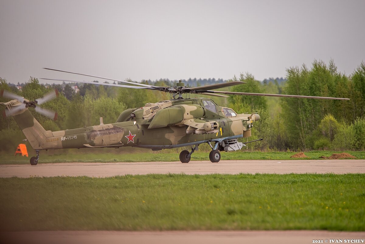 Как уже многим известно, 15 мая 2021 года на аэродроме Кубинка состоялся праздник, посвященный 30-летию авиационных групп высшего пилотажа "Стрижи" и "Витязи". Сегодняшний обзор уже четвертый в ряду обзоров, посвященных летной программе (ссылки на остальные - внизу страницы). До этого все обзоры были про выступления хозяев праздника и их гостей на самолетах, и вот теперь пришло время для одной из самых необычных пилотажных групп - вертолетной. Речь, конечно же, о пилотажной группе "Беркуты" из Торжка. 1. К моменту полетов вертолетной группы народ, насмотревшийся всякого самолетного пилотажа уже немного пресытился полетами и несколько отхлынул от заграждений. В итоге к заграждениям удалось попасть мне. Хотя и не было свободно, но "окна" между людьми были и коу-что поснимать удалось. В частности вот один из вертолетов Ми-28Н с бортовым номером 71 желтый выруливает на ВПП аэродрома Кубинка. 2. Любопытный кадр. Видимо солдатам из охранения настолько наскучили полеты тренировочные и показат