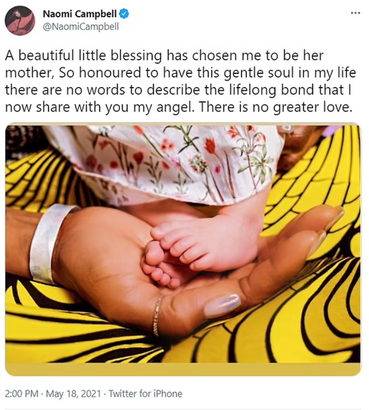 50-летняя супермодель и суперхолостячка Наоми Кэмпбелл внезапно стала мамой! В своём блоге в Instagram она опубликовала фото с крошечными ножками новорожденного на ладони и сообщила, что её «выбрали в качестве матери». Как она назвала свою малышку, пока неизвестно, в блоге она обращается к ней «Прекрасное маленькое благословение». «Чёрная пантера» уже 4 года назад поднимала в интервью тему семьи и рассказывала, что всё время думает об этом, но не торопится, поскольку рассчитывает на достижения науки. Сейчас Кэмпбелл не замужем и не в отношениях. Её последний роман был с рэпером Skepta в 2018 году. По слухам, через год она встречалась с британским певцом Лиамом Пейном, но всего лишь пару месяцев. Кто отец девочки, естественно, неизвестно. Время изоляции Наоми, похоже, использовала как раз, чтобы скрыть одно из самых важнейших событий в своей жизни. Она просто сияла и лучилась счастьем, когда опубликовала в блоге также своё последнее интервью с модельером Дайан фон Фюрстенберг. Интервью