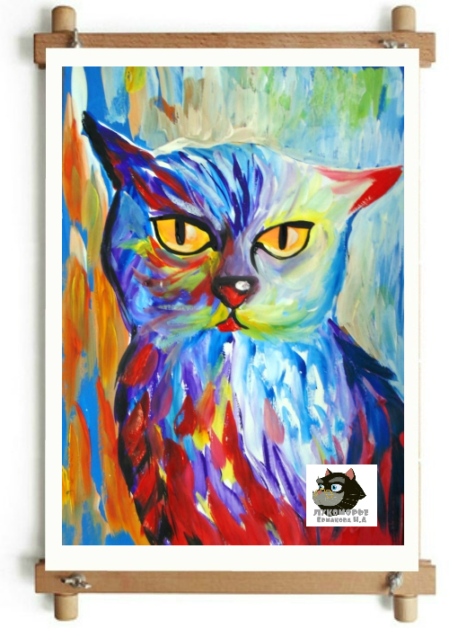 Начинаем строить наш образ с головы кота. Условно делим лист на две части, в верхней его части будет голова, в нижней туловище (рисуем две линии - размер головы). Далее рисуем линии головы по бокам, и линии туловища Котофея. Мы сделали набросок, разместили рисунок на формате листа. Теперь прорисовываем детали,линии туловища и головы делаем более плавными. Рисуем ушки,глаза, нос, щёки и язык кота. Начинаем работу в цвете.Тёмно голубым обрисовываем силуэт кота. Этим же цветом заполняем всё пространство листа (фон).Мазки кистью вертикальные. Работаем над фоном, вводим в него вертикальные мазки красного, жёлтого и белого цветов. Работаем на Котофеем, заполняем его силуэт белой гуашью. Середину глаз заполняем оранжевым цветом. Его можно получить смешав жёлтую и красную краску. Затем