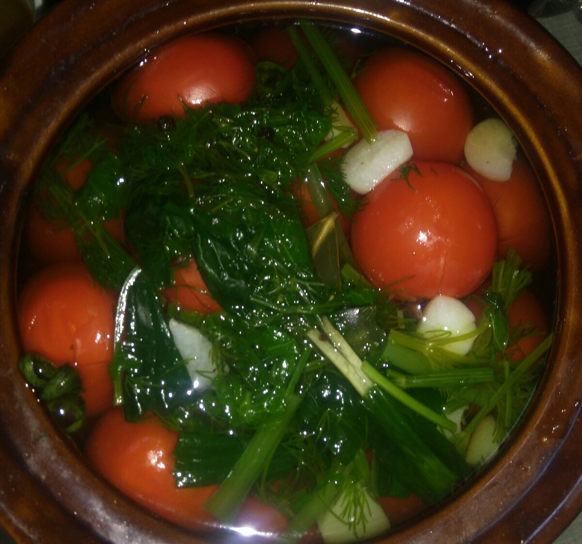 Ингредиенты: Помидоры с плодовитой ножкой Огурцы Лук репчатый Укроп Семена укропа Петрушка Острый перец Перец горошком Лавровый лист Гвоздика для солений Чеснок Соль Сахар Уксус Способ приготовления: Выбираем ёмкость для солений. Конечно чем больше, тем лучше. Кастрюля, глиняный горшочек - удобнее всего делать соления в этих ёмкостях. Сегодня я делаю соления в глиняной посуде. Перед тем, как мы начнём заниматься солениями. Берём помидоры и огурцы и замачиваем в холодной воде в большой ёмкости на три часа перед началом приготовления. Прошло три часа, хорошо промываем помидоры и огурцы. Плодовитую ножку у помидор не отсоединяем. Солить помидоры будем вместе с оставленной зелёной частью от куста. Приступим готовить рассол. Помидор и огурцов мы взяли достаточно, и ёмкость не маленькая. Значит и рассола нам понадобится прилично, поэтому берём большую кастрюлю. И из расчёта ёмкости, в которой будем солить, рассчитываем сколько потребуется рассола. Наливаем воду в кастрюлю и ставим на ого