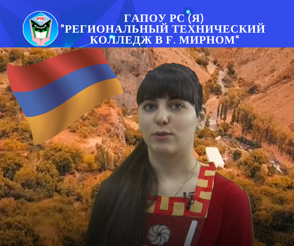 Студентка первого курса ГАПОУ РС (Я) «МРТК» Айкануш Маргарян, обучающаяся по специальности «Экономика и бухгалтерский учет», принимает участие в конкурсе красоты и таланта «Этно Краса-2021». Конкурс проводится в рамках реализации проекта «Ысыах дружбы Детской Ассамблеи народов Республики Саха (Якутия)». В видеоролике участница представила свою визитку, где рассказала о себе, об истории, обычаях и традициях армянского народа, озвучила свой жизненный девиз на родном языке: «Одна нация – одна культура». Учредителем конкурса является МАУ "Управление спорта, культуры и молодежной политики" МО "Город Мирный". Организатор - ООРКТД «Детская Ассамблея народов РС (Я)», МАУ ДО «Центр дополнительного образования» г. Мирный. Цель Конкурса - укрепление дружеских связей подрастающего поколения; Задачи: - поддержка и развитие молодежного творчества и сохранения культурного наследия народов, проживающих на территории Мирнинского района; - выявление и поддержка талантливой молодежи, развитие творческого