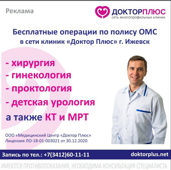 «Доктор плюс» - сеть многопрофильных клиник. 5 причин, почему выбирают «Доктор плюс»: ✔ удобное расположение клиник в разных районах города ✔ быстрый и комфортный прием - по записи, без очередей ✔ более 200 высококвалифицированных специалистов ✔ современное оборудование ✔ душевное отношение к пациентам, поддержка и забота Мы рядом и работаем для Вас! Имеются противопоказания, необходима консультация специалиста. Выданные лицензии - на сайте www.doktorplus.net Реклама