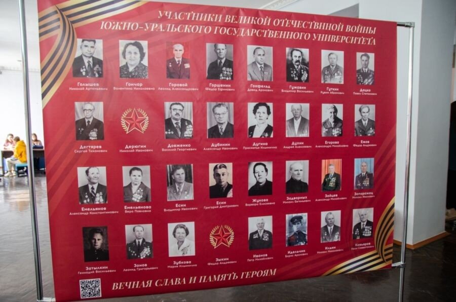 Челябинский механико-машиностроительный институт (ныне ЮУрГУ – Южно-Уральский государственный университет) был создан в грозном и славном 1943-м. С самого начала в вузе работали те, кто ковал оружие Победы. В дальнейшем многие фронтовики и труженики тыла учились и преподавали в университете. «Бессмертный полк ЮУрГУ» – так называется выставка, которая проходила с 27 апреля по 15 мая в фойе третьего этажа главного корпуса университета. Экспозиция демонстрировалась впервые, она включает более двух сотен имён работников вуза – участников Великой Отечественной войны. На самом деле ветеранов Великой Отечественной войны, имеющих отношение к этому университету, было больше. Но, к огромному сожалению, многие архивные документы утрачены. На выставке можно видеть фотопортреты фронтовиков. «Бессмертный полк Южно-Уральского государственного университета» – это проект, который инициировали Управление по внеучебной работе, Совет ветеранов и музейно-образовательный комплекс ЮУрГУ.