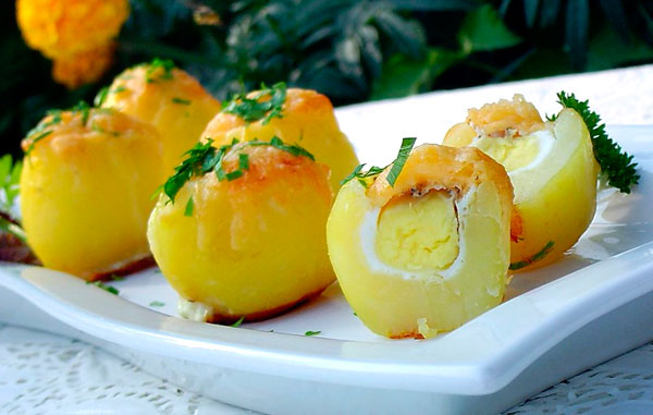 1)Картофель желательно отобрать средних размеров. А если это будет ещё и молодая картошка, будет ещё лучше. Для начала, овощи следует отварить удобным вам способом и остудить. 2)Затем срезаем макушку и для устойчивости немного низ. И затем, при помощи чайной ложки, аккуратно вырезаем внутренность так, чтобы туда можно было поместить начинку 3)Разложив на противень основание блюда, вовнутрь картофеля вбиваем по одному перепелиному яйцу. По вкусу посолить и поперчить душистым чёрным перцем 4)Начинённую картошку с яйцами щедро посыпаем тёртым твёрдым сыром и перекладываем форму в горячую духовку. Выпекаем не более 20-25 минут, при температуре 180 градусов, тем временем сыр должен расплавиться и покрыть румяной шапочкой поверхность картофеля.