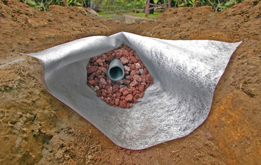 Следующий этап — собственно прокладка труб. Чтобы отверстия в дренах не забивались грязью, необходим еще один фильтр, который подбирают в зависимости от типа почвы на участке. На глинистых грунтах лучше всего работает оболочка из кокосового волокна. В продаже можно найти готовые трубы, обернутые этим материалом. Для суглинков подходит геотекстиль толщиной от 2 до 4 мм. А если в грунте преобладает песок, подойдет стеклохолст и схожие с ним тонкие материалы.