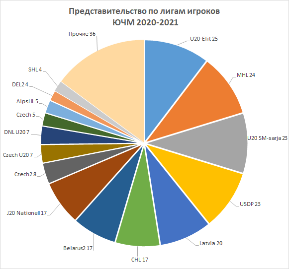 7 мая завершился Юниорский чемпионат мира по хоккею 2021. Основываясь на данных портала www.eliteprospects.com, посчитаем некоторую статистику по итогам ЮЧМ 2021. В топ-дивизионе ЮЧМ 10 команд. В этом году это были Беларусь, Германия, Латвия, Канада, Россия, США, Финляндия, Чехия, Швейцария, Швеция. Согласно заявкам это 248 юных игроков, если считать только вышедших на лед Чемпионата их 243. Рассмотрим какие лиги представляли игроки и какова была результативность представителей этих лиг. Исходные данные портала eliteprospects от 8 мая 2021 года. Наибольшее представительство на ЮЧМ обеспечила швейцарская лига U20-Elit - 25 игроков, вторая по представительности МХЛ - 24 игрока, по 23 хоккеиста представляли финскую U20 SM-sarja и американскую программу USDP. Если рассмотреть составы команд относительно представительства лиг, то российскую сборную представляли 22 игрока МХЛ и три юниора уже закрепившихся во взрослой ВХЛ, это Никита Чибриков, Федор Свечков и Дмитрий Кателевский. У чемпионов