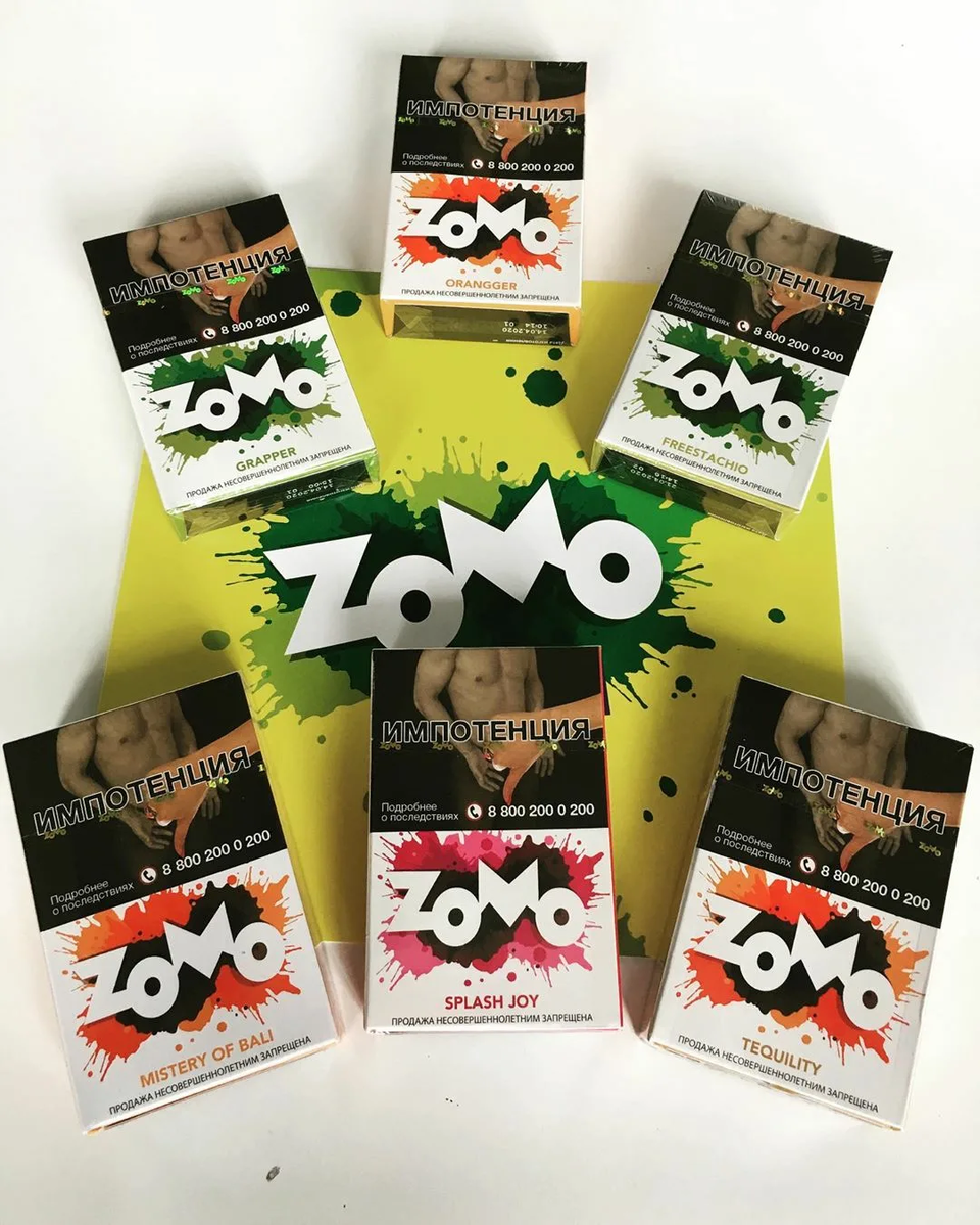 ZOMO — это коллекция ярких и насыщенных вкусов, классических ароматов и экзотических сочетаний. Это не просто бренд, а образ жизни, объединяющий все, что ты любишь. Жаростойкость табака и яркие вкусы ZOMO делают его крутым при любой забивке, кроме одного случая — когда он закончился И всё-таки есть несколько рекомендаций, чтобы оценить все качества ZOMO на максимум: 1. Запастись ZOMO. 2. Взять глиняную прямоточную чашу типа UPG. 3. Воздушно забить табак. 4. Использовать 3 угля размером по 25 мм. 5. Подождать пять минут, пока чаша прогреется. 6. Наслаждаться любимым вкусом. Судя по цвету смеси и скудной информации о ней, в составе присутствует лист Gold Virginia и, быть может, Burley. Упаковка приятная на вид – классическая бумажная коробочка с запаянным пакетиком смеси внутри. Как обычно, мы получаем 50 грамм смеси, за целых 250 рублей в розницу, но существуют объёмы и в 500 гр, а также 6 кг. К слову, достать табак тоже нелегко. Топ вкусов и миксы Zomo Из такого большог