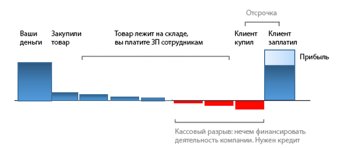 Представьте ситуацию: в феврале вы делаете поставщику предоплату, в марте вам отгружают товар и до августа он лежит. В июле вам звонит клиент и вы закрываете сделку. В августе клиент получает товар и договаривается с вами об отсрочке платежа до сентября. Вот как выглядит денежный поток:
