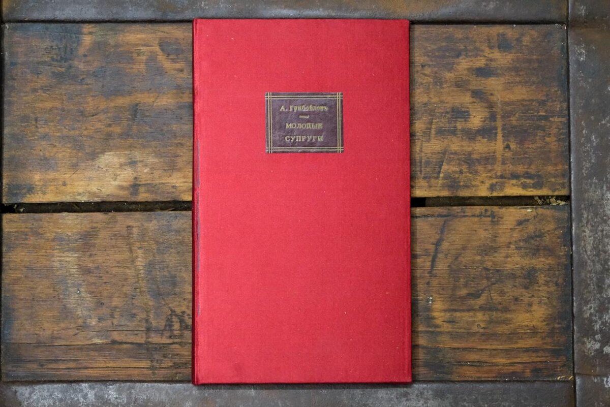 Александр Сергеевич Грибоедов - классик русской литературы. Однако не все его произведения известны широкой аудитории. Сегодня мы поговорим о раннем творчестве писателя, в частности, о его книге «Молодые супруги», которая попала к нам в мастерскую. Сразу хочется отметить, что у данного издания был поздний переплет, скорее всего, начала XX века. Выглядела она не совсем обычно: переплетные крышки обтянуты шелком, а на сторонке кожаная марка с названием. Перед нами стояла задача изготовить для него подходящий по стилистике футляр, который будет не только эстетически привлекательно выглядеть, но и решит вопрос хранения. Произведение «Молодые супруги» является вольным переводом комедии французского драматурга Крезе де Лессера «Семейная тайна». В начале XIX столетия эта комедия увидела свет и уже тогда в ней поднималась актуальная и сейчас, в XXI веке, проблематика. На страницах книги автор отвечает на вопрос, что же делать молодым супругам, если буквально сразу после свадьбы у них пропадает