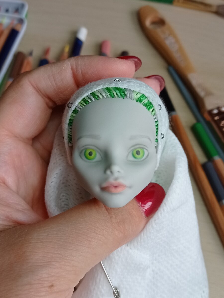 У куколки прошита голова локонами козочки, которые я окрасила в микс зелёных, светло-зеленых и серебристых прядей.