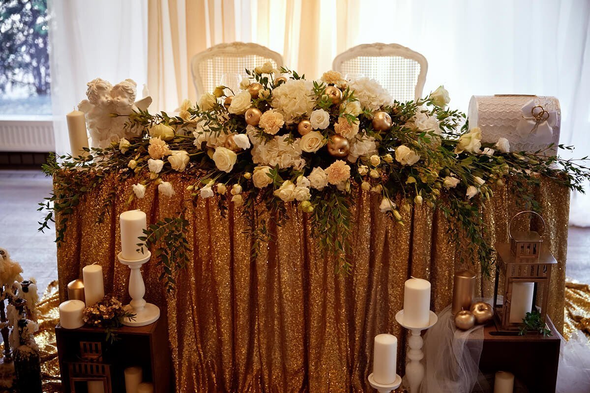 И, конечно, оформление свадьбы в золотом цвете идеально для нетематического праздника. Золото отлично гармонирует с белым платьем невесты и темным смокингом жениха.