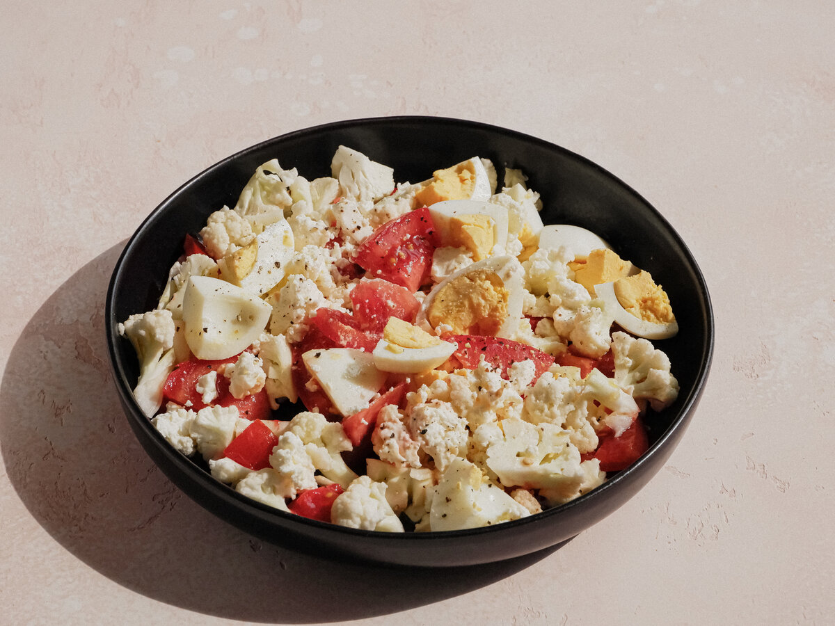 Из овощей я взяла помидорки + цветную капусту, из солёных акцентов - сыр фету, а из белка - варёные яйца.