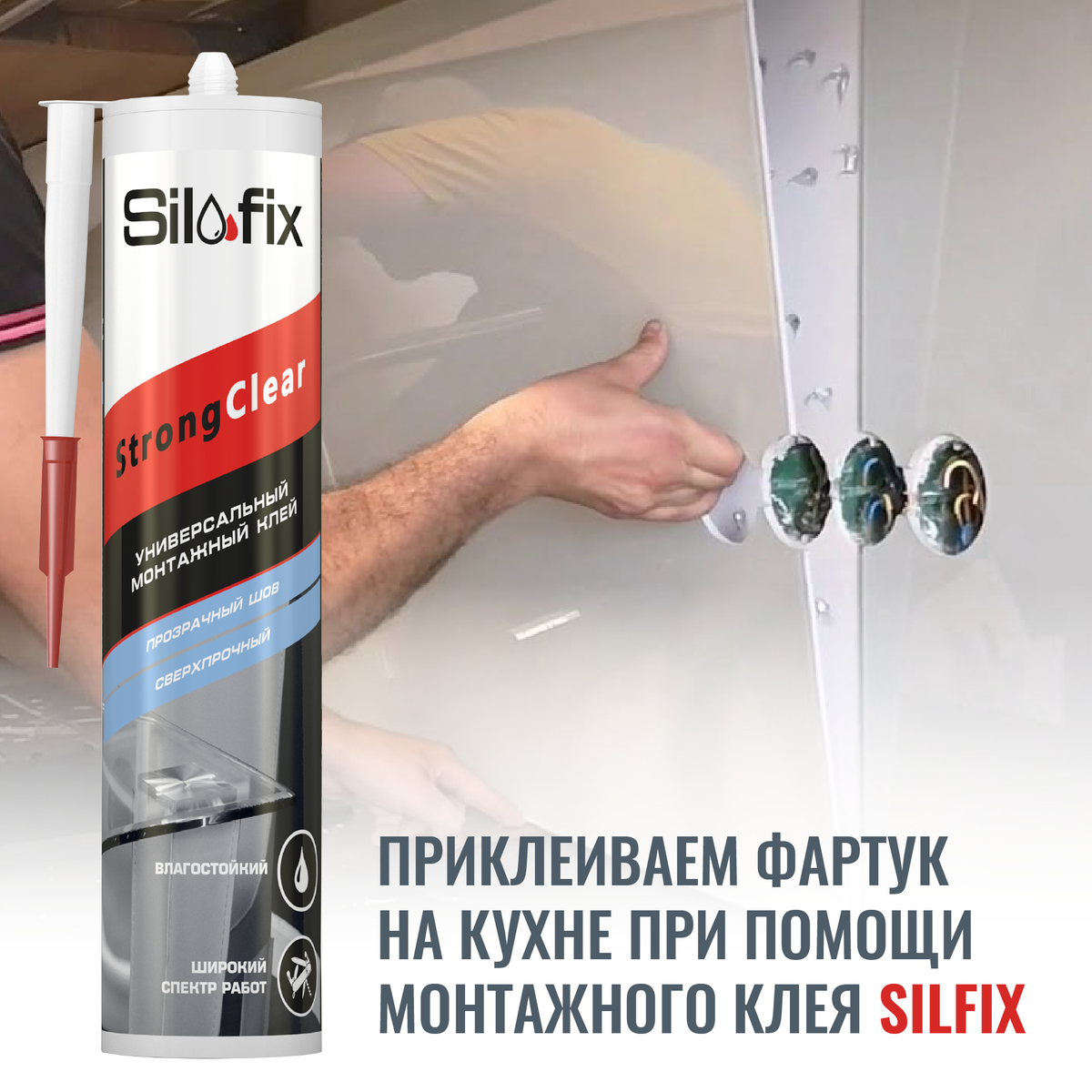 Заменить кухонный фартук на новый вы можете при помощи жидких гвоздей или саморезов. Крепеж на основе жидких гвоздей более простой и менее хлопотный, поскольку отпадает необходимость в подготовке стен и сверлении отверстий. Мы рекомендуем Вам использовать универсальный монтажный клей SILFIX StrongClear на основе синтетического каучука, он надежно склеит поверхности, не нанося ущерба панелям.
