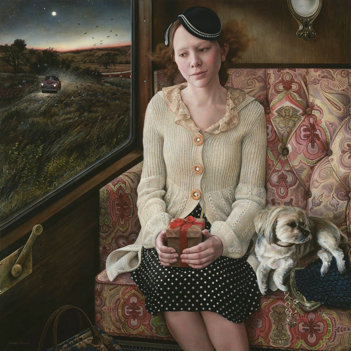 Картины американской художницы Андреа Коуч полны невыразимого очарования. Всегда она изображает молодых женщин, очень серьезных, задумчивых, несколько отстраненных, как будто мысли их где-то очень далеко. Очень часто на фоне сельских пейзажей. Есть в этих девушках что-то не от мира сего, вот и девушка выше держит какую-то птицу. И много их, девушек с птицами. "Так бы развела руки и полетела..." А не ведьмы ли эти девушки? Но не хочу о ведьмах, я люблю людей. Не знаю, как называется эта работа. Милая девушка едет в поезде, а за окном смеркается. Вся картина в приглушенных тонах. Скромно сидит на уютном диванчике. На ней забавная шляпка и смешная прическа (на многих картинах Коуч у героинь такие прически). Сумочка тут, сумочка там, а в руках загадочная коробочка. Что там? Подарок кому-то или от кого-то? Собачонка к ней тулится, но смотрит в другую сторону - там что-то происходит. Но девушке ни до чего нет дела. И в окно она тоже не смотрит, а там, между прочим, очень живой пейзаж: маш