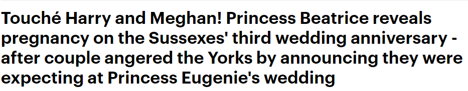 Туше Гарри и Меган! Принцесса Беатрис рассказала о своей беременности в третью годовщину свадьбы герцогов Сассекских - после того, как эта пара разозлила Йорков, объявив прямо на свадьбе принцессы Евгении, что ждут ребенка.