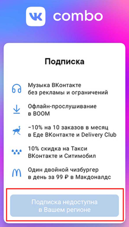 Как пофиксить? Когда сам столкнулся с проблемой и пытался найти решение в интернете - все, что мне попадалось - советы по типу "Юзайте прокси, впн". Однако проблему можно решить гораздо проще, если не получается оформить подписку напрямую в ВК, будем искать обходной путь. Для этого: 1. Устанавливаем BOOM, если он, конечно, еще не установлен. 2. Переходим в настройки профиля. 3. Сверху будет уведомление об отсутствии подписки, вам предложат ее оформить, жмёте туда. 4. Из всех предложенных вариантов выбираете подписку VK Сombo. 5. Наслаждаетесь всем функционалом подписки.